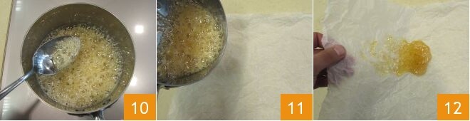 e deixe ferver até obter um caramelo loiro. Pegue uma folha de papel manteiga e amasse-a; quando o caramelo estiver pronto 10, despeje uma pequena parte sobre o papel manteiga amassado 11 e deixe espalhar para criar uma base irregular 12.