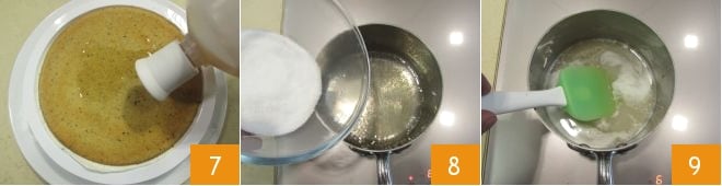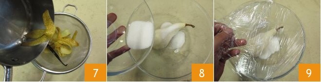 Misture, então você pode coar 7, assim terá pronto o xarope para umedecer as bases do bolo. Em uma tigela, coloque uma pera inteira descascada (deixando o cabinho) e cubra com açúcar 8, gire a tigela para que o açúcar se distribua sobre a pera. Em seguida, cubra com filme plástico 9 e coloque na geladeira por pelo menos 1 hora. Depois, passe ao micro-ondas por 4 minutos na potência máxima.