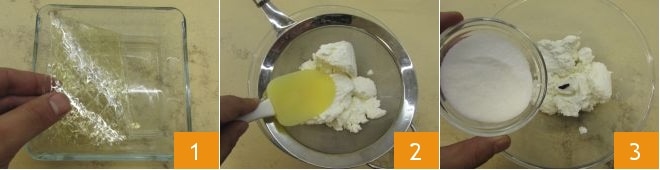 Coloque a gelatina em folhas em uma tigela com água fria 1. Enquanto isso, pegue a ricota de búfala e vaca e deixe escorrer o soro (mesmo a noite toda, se necessário), passe-as por uma peneira 2, então adicione as sementes de baunilha que você reservou antes e 80 g de açúcar 3.