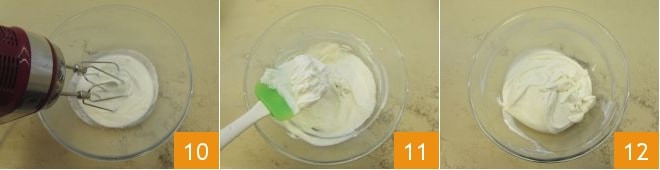 Bata o creme de leite e o açúcar com os batedores de uma batedeira elétrica perfeitamente limpos 10. Em seguida, adicione o creme de leite ao creme de ricota, primeiro uma espatulada mexendo energicamente 11, depois o restante, mexendo delicadamente de cima para baixo para não desmontar o creme de leite. Assim, você obterá seu creme liso e aveludado 12. Você pode colocá-lo em um saco de confeitar descartável com bico liso.