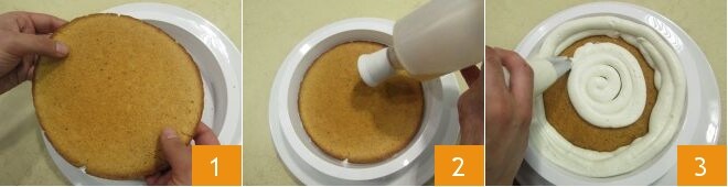 Agora você pode passar para a montagem e decoração do bolo de ricota e pera: pegue um disco de acetato do tamanho de 22 cm (como o diâmetro das duas bases). Coloque-o em um prato de servir e coloque dentro um dos discos 1. Umedeça com a calda de peras 2, depois crie uma camada de creme distribuindo com o saco de confeitar, primeiro com algumas voltas na borda, as outras no centro 3.