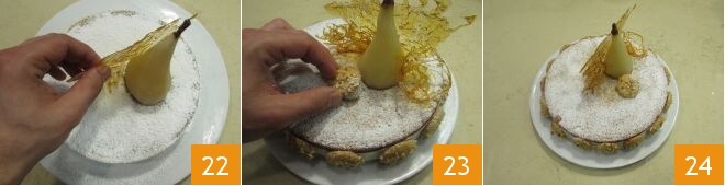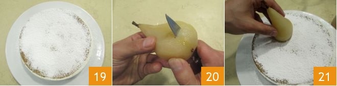 Povilhe o bolo com açúcar de confeiteiro, depois corte a base da pera inteira 20 e coloque a pera sobre o bolo 21.