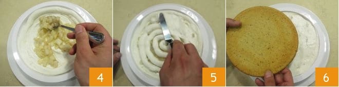 Distribua as peras cozidas 4, depois outra camada de creme de ricota e espalhe para uniformizar a camada 5. Coloque o outro disco por cima 6,