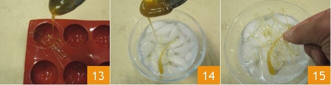 Deixe descansar por 1-2 minutos o caramelo restante, para que ele engrosse, e crie uma decoração em forma de cúpula distribuindo fios de caramelo sobre um molde de silicone em esferas 13. Depois, despeje a parte restante em fio em uma tigela com água fria e gelo 14 para que solidificando se criem outras decorações 15.