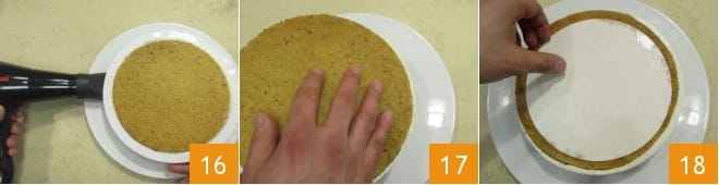 Passadas as 2 horas, retire o bolo de ricota e pera da geladeira: para remover mais facilmente o disco de acetato, você pode aquecer com um secador de cabelo a borda externa 16, depois vire o bolo 17 e remova tanto a borda quanto a base 18.