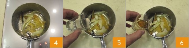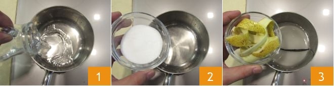 Despeje a água em uma panela 1 junto com o açúcar 2, a fava de baunilha sem sementes (que você vai reservar) e as cascas de pera 3.