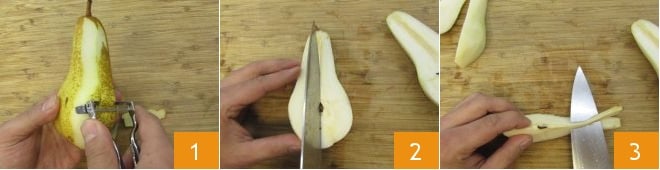 Lave e descasque as peras com um descascador de legumes (reserve as cascas, pois você precisará delas posteriormente) 1; divida as peras ao meio 2, remova o miolo 3