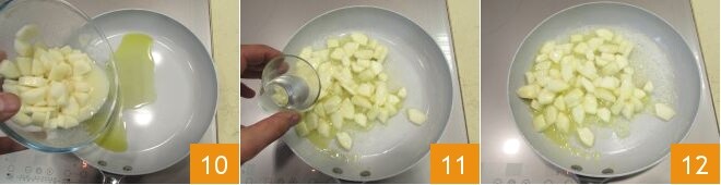 Em uma frigideira grande, coloque um fio de azeite de oliva extravirgem e deixe aquecer; adicione os cubinhos de pera 10 e mexa. Cozinhe por alguns minutos, depois adicione um pouco de água e aromatize com as sementes de 1/3 da fava de baunilha; cozinhe por mais alguns instantes, mexendo ocasionalmente e deglaceie com o destilado de pera 11. As peras devem permanecer crocantes. Despeje as peras cozidas, ainda quentes, em uma tigela, recuperando bem o suco, e cubra com filme plástico. Deixe esfriar e, enquanto isso, prepare a calda de peras.
