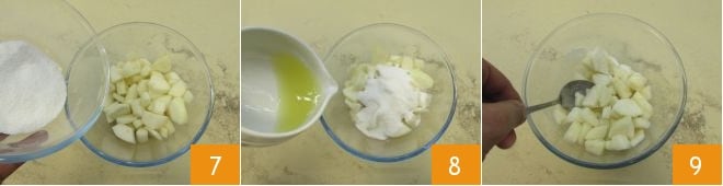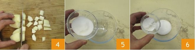 e corte-as em cubinhos 4. Coloque os cubinhos de pera em uma tigela; em outra, coloque o açúcar 5 e o amido 6, misture-os