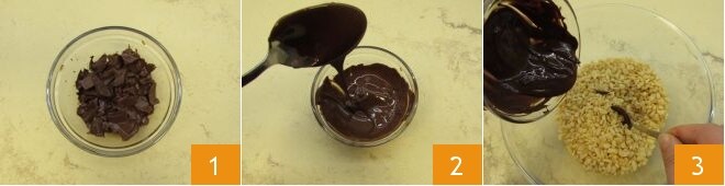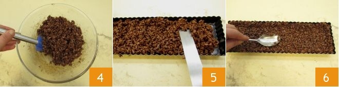 misture para combinar bem os ingredientes 4. Transfira a massa obtida para uma forma de torta retangular de 35x11 cm (de preferência com fundo removível), distribua uniformemente por toda a forma a mistura de arroz tufado 5, e pressione-a finalmente com as costas da colher para compactá-la o melhor possível 6. Uma vez feita a base, coloque-a para endurecer na geladeira por cerca de 1 hora.