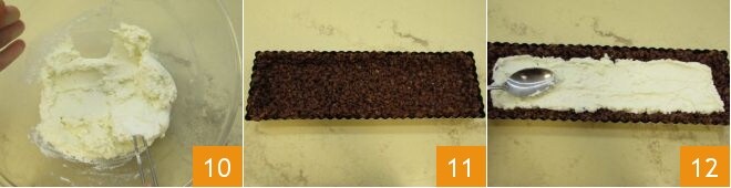 Misture com uma espátula o creme para que fique homogêneo 10, pegue a forma com a base que já terá endurecido 11, recheie-a com metade do creme de ricota, tendo o cuidado de distribuí-lo por toda a superfície e compactá-lo com as costas da colher 12