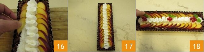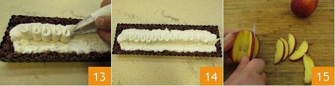 Despeje a outra metade do creme em um saco de confeitar com bico em formato de gota e distribua o recheio na parte central da torta, criando um padrão ondulado 13 14. Agora, lave os pêssegos e corte-os finamente, mantendo a casca 15.