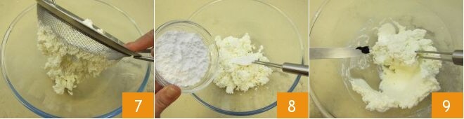 Enquanto isso, ocupe-se do creme: peneire a ricota através de uma peneira de malha fina para torná-la mais lisa 7, depois adicione o açúcar de confeiteiro 8 e, por último, corte a fava de baunilha no sentido do comprimento e com uma faca extraia as sementes para adicioná-las ao creme para aromatizá-lo 9