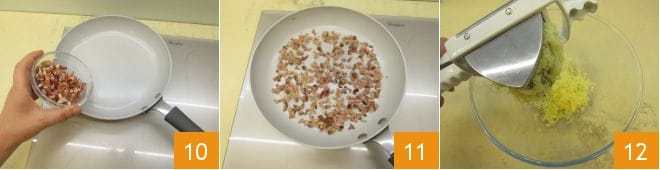 Aqueça uma frigideira antiaderente e, quando estiver quente, adicione o bacon 10, deixando dourar por 2-3 minutos até que fique crocante 11. Pegue as batatas, que já devem ter amornado, e esmague-as com um espremedor de batatas, coletando a polpa em uma tigela 12.