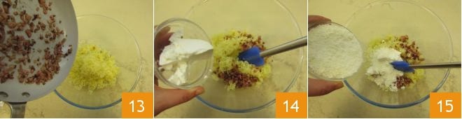 Adicione às batatas o bacon crocante 13, a ricota 14 e o Parmesão ralado 15.