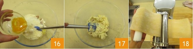 Junte também o ovo 16, ajuste o sal e a pimenta e misture bem para incorporar os ingredientes 17. O recheio está pronto: você pode cobri-lo e colocá-lo na geladeira. Retome a massa fresca e divida o bloco em duas partes, guardando na geladeira o bloco que não vai trabalhar imediatamente, sempre coberto com filme plástico. Trabalhe o primeiro bloco de massa e abra-o na máquina de macarrão 18, começando pela espessura maior até chegar ao penúltimo número: você deve obter duas folhas de cerca de meio milímetro de espessura. Em seguida, faça o mesmo com o outro bloco, para obter duas folhas de espessura igual.