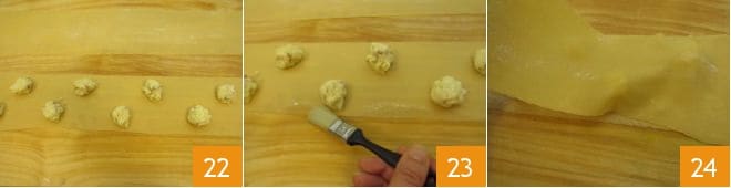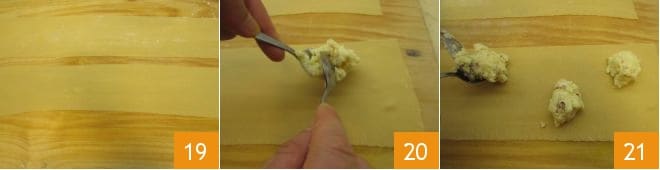 Coloque as folhas abertas na superfície de trabalho 19 e comece a distribuir sobre uma das folhas uma colher de chá de recheio de cada vez, formando montinhos espaçados entre si 2 ou 3 centímetros e posicionados de forma alternada (20-21).
