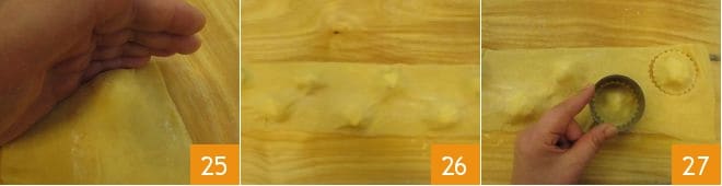 e, ajudando-se com as mãos, sele a massa ao redor do recheio 25, para que saia todo o ar 26. Com um cortador de massa com diâmetro de 6 cm, corte os tortelli 27