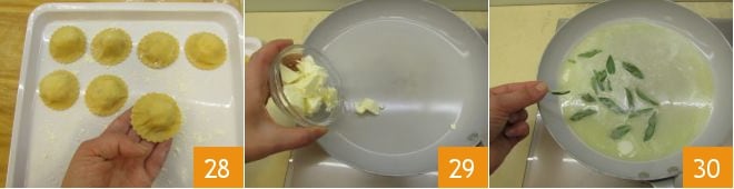 colocando-os de cada vez em uma bandeja polvilhada com um pouco de farinha 28 ou em um pano de prato limpo e seco. Coloque uma panela com bastante água salgada para ferver no fogo, onde você vai cozinhar os tortelli. Enquanto isso, em uma frigideira grande, derreta a manteiga 29 e adicione as folhinhas de sálvia 30.