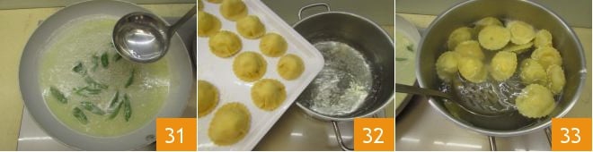Sal e pimenta e adicione uma concha de água quente retirada da panela dos tortelli 31. Quando a água estiver fervendo, coloque os tortelli 32 e deixe cozinhar por um par de minutos 33.