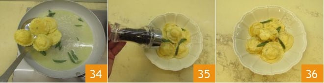 Quando estiverem cozidos, escorra-os com uma escumadeira e adicione-os à frigideira com o tempero 34. Salteie os tortelli com manteiga e sálvia por alguns instantes, mexendo muito delicadamente para não quebrá-los. Sirva, polvilhando com um pouco de pimenta-do-reino moída 35 antes de servir. Seus tortelli de batata e bacon com manteiga e sálvia estão prontos para serem saboreados 36!