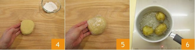 Continue trabalhando a massa até que fique lisa e compacta 4, depois envolva a massa em filme plástico 5 e deixe descansar por 30 minutos em lugar fresco e seco. Enquanto isso, cuide das batatas: lave-as e coloque para ferver inteiras e com a casca 6 até ficarem macias por cerca de 40 minutos. Quando estiverem cozidas, escorra e deixe amornar.