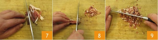Passe agora para o bacon: corte-o primeiro em tiras 7, depois em cubos 8 e, por fim, pique finamente com uma faca para obter pedaços bem pequenos 9.