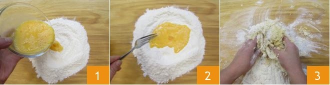 Para preparar os tortelli de batata e bacon com manteiga e sálvia, comece pela preparação da massa para os tortelli: despeje a farinha sobre uma tábua (você pode segurar um pouco a quantidade de farinha e adicionar conforme necessário enquanto trabalha a massa) e, no meio, adicione os ovos 1. Bata-os um pouco com o garfo para misturar os ingredientes 2 e depois compacte com as mãos. Caso a massa esteja dura ou não consiga incorporar toda a farinha, você pode adicionar uma ou duas colheres de sopa de água morna. Se, por outro lado, a massa parecer muito líquida, adicione uma pitada de farinha a mais conforme necessário 3.