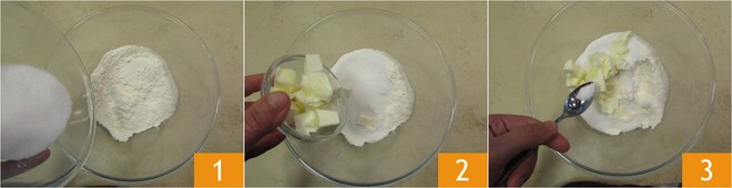 Para preparar as Tortinhas com creme de Skyr, peras e castanhas de caju, comece pela massa. Coloque em uma tigela a farinha, o açúcar 1, a manteiga fria 2 e uma pitada de sal 3.