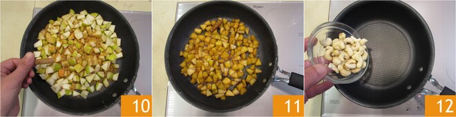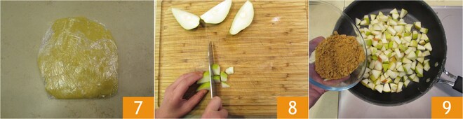 Cubra com filme plástico 7 e deixe descansar na geladeira por pelo menos 30 minutos. Enquanto isso, cuide das peras. Lave e corte as peras em cubinhos 8. Em uma frigideira, coloque as peras e o açúcar 9.