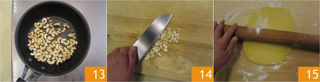 Uma vez torradas 13, triture-as 14. Abra a massa até uma espessura de cerca de 7-8 mm 15.