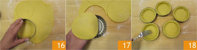 Corte discos com um cortador de 11 cm de diâmetro 16 e coloque os discos obtidos nas forminhas de tortinhas de 10 cm de diâmetro 17. Com o restante da massa, continue fazendo o restante das tortinhas, você obterá 5 peças. Com um garfo, fure a base das tortinhas 18.