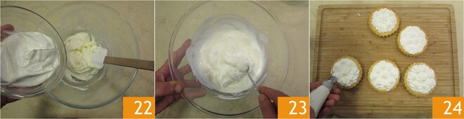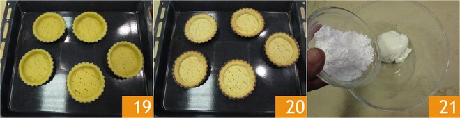 Asse em forno pré-aquecido a 180 °C por 20 minutos 19. Uma vez assadas, deixe as tortinhas esfriar 20. Cuide do creme: em uma tigela, misture o mascarpone e o açúcar de confeiteiro 21.