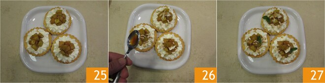 Recheie com as peras cozidas 25, as castanhas de caju trituradas, o caldinho das peras e algumas folhinhas de hortelã 26. As Tortinhas com creme de Skyr, peras e castanhas de caju estão prontas para serem saboreadas 27.