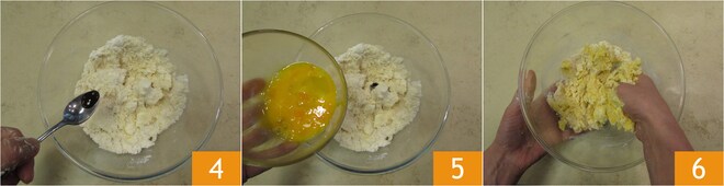 Misture rapidamente com as mãos e, no final, adicione também o extrato de baunilha 4 e o ovo 5. Misture até amalgamar bem 6.