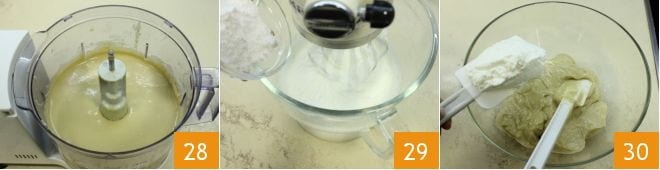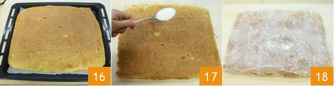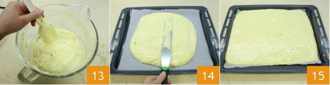 Incorpore os ingredientes com uma espátula 13. Espalhe a massa em um papel manteiga colocado em uma assadeira de 45 x 37 cm e nivele com uma espátula plana e lisa até atingir a espessura de 1 cm (14-15). Asse em forno estático pré-aquecido a 220°C por 6-7 minutos (não mais); a superfície do bolo deve ficar levemente dourada e você nunca deve abrir o forno, que irá reter a umidade.