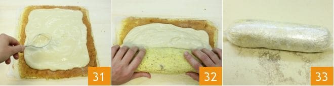 Quando a massa do biscoito estiver fria, retire o filme plástico e recheie com o creme de café, espalhando sobre toda a superfície com uma colher ou uma faca longa de lâmina lisa, deixando uma margem de cerca de 2 cm para evitar que transborde quando for enrolar 31. Neste ponto, após terminar o recheio, enrole delicadamente a massa 32 e envolva-a com filme plástico e mantenha na geladeira para compactar 33.