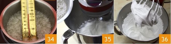 Por último, prepare o merengue italiano. Em uma panelinha, adicione o açúcar e a água, aqueça em fogo baixo até dissolver o açúcar, quando a calda começar a ferver, mergulhe o termômetro até atingir 120°C 34. Enquanto isso, bata as claras em neve com algumas gotas de suco de limão e, quando a calda atingir a temperatura indicada, despeje lentamente nas claras, continuando a bater com o batedor 35. Quando o merengue estiver denso e liso 36