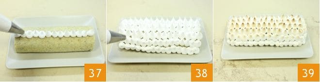 transfira-o para um saco de confeitar com bico estrelado e decore a superfície do tronco com bicos de merengue (37-38). Coloque o tronco no forno por 5 minutos sob a grelha bem quente para dourar o merengue. Seu tronco de café com merengue flambado está pronto para ser saboreado 39!