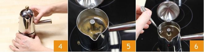 Não pressione com a colher, nem faça furos e aperte bem a cafeteira 4 (para evitar que o café saia pelos lados enquanto sobe), depois coloque-a em uma chama baixa e constante para obter um café encorpado. À medida que o café sobe, formará uma espuma densa 5; recomendamos não deixar borbulhar por muito tempo, para manter o aroma e a doçura intactos. Então desligue o fogo e o seu café para usar na preparação está pronto: mexa diretamente na moka com uma colher para torná-lo mais homogêneo 6.