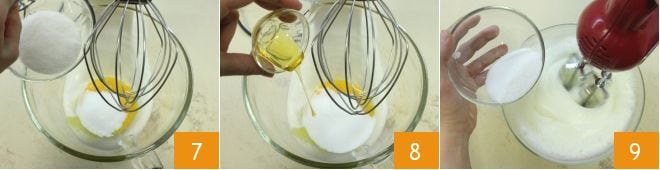 Agora prepare a massa do biscoito: em uma batedeira com batedor, coloque as gemas, 90 g de açúcar refinado 7 e o mel 8, ligue a máquina até obter uma mistura clara. À parte, bata as claras em neve com o açúcar restante 9