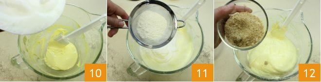 até obter uma mistura clara e espumosa, (se você não tiver uma batedeira, use uma batedeira elétrica). Adicione as claras batidas à mistura 10. Em seguida, adicione a farinha 00 11 e a farinha de avelã 12