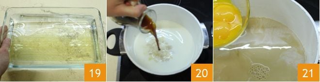 Agora prepare o creme. Pegue uma tigela, encha-a com água fria e coloque a gelatina de molho 19. Depois, pegue uma panela e adicione o leite, o café da moka 20, as gemas 21 e