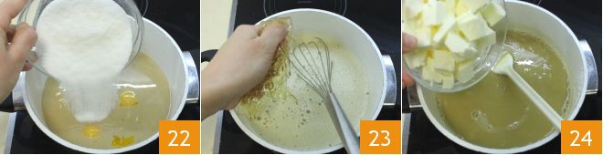 o açúcar 22 e leve à fervura. Adicione a gelatina espremida 23, a manteiga em cubos 24