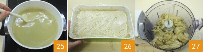 e derreta a mistura até ferver por 2 minutos 25. Desligue o fogo e despeje o creme em um recipiente largo e raso. Cubra com filme plástico e coloque na geladeira para esfriar e engrossar por cerca de 3-4 horas 26. Quando o creme estiver frio e firme, passe-o no mixer 27.