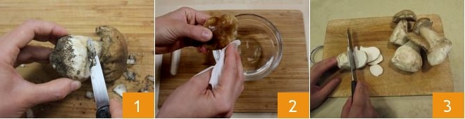 Para preparar a sopa cremosa de cogumelos porcini, comece preparando o Caldo de legumes. Enquanto isso, dedique-se à Como limpar os cogumelos porcini: com a ajuda de uma faquinha, raspe a terra presa ao cogumelo 1. Se houver muita terra, você pode passar os cogumelos rapidamente sob um jato de água fria (geralmente é preferível evitar essa operação para não absorverem água) 2. Se os cogumelos tiverem pouca terra presa, remova-a delicadamente com um pincel. Depois, com um movimento rotativo muito delicado, separe o talo do chapéu do cogumelo, cortando ambos em fatias finas no sentido do comprimento 3. Uma vez prontos, reserve-os.