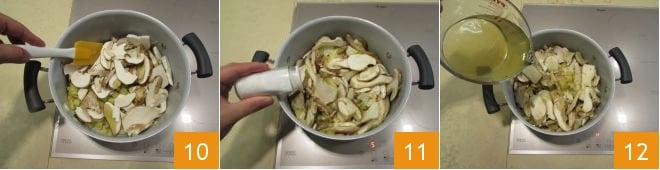 Aqueça em fogo moderado por cerca de 1 minuto, mexendo os ingredientes para não grudarem no fundo 10. Depois, ajuste o sal 11 e a pimenta. Por fim, adicione o caldo de legumes 12: deixe cozinhar os ingredientes por cerca de 20 minutos em fogo moderado.