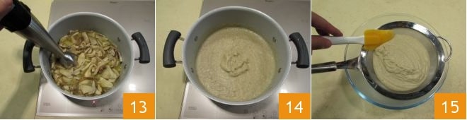 Quando o caldo tiver sido absorvido, usando um mixer de imersão, bata os ingredientes 13: você deve obter uma mistura homogênea 14 que pode ser reunida em uma tigela, coando com uma peneira para torná-la mais cremosa 15.