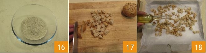 Sua sopa cremosa de porcini estará pronta, mantenha-a aquecida 16. Agora dedique-se ao pão: corte-o em fatias e depois em cubinhos de cerca de meio centímetro 17. Disponha-os uniformemente em uma assadeira forrada com papel manteiga e regue-os com um fio de azeite 18. Depois, ajuste o sal.