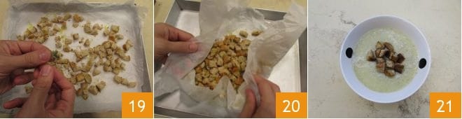 Tempere com folhas de orégano 19 e para temperar uniformemente, você pode levantar levemente as bordas do papel manteiga para misturar os croutons dentro 20. Para deixar os croutons crocantes, coloque-os para assar em forno estático pré-aquecido no modo grill a 240°C por cerca de 3 minutos. Quando estiverem prontos, retire-os e adicione-os sobre a sua sopa cremosa de cogumelos porcini já servida (se preferir, também com algumas fatias de porcini aquecidas na panela). Você pode decorar com um fio de azeite e depois desfrutar ainda quente 21!